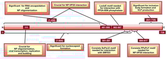 Additionally, various post-translational modifications of NP are documented. It was shown that NP undergoes O-glycosylation and sialylation, which are significant for NC formation [87,94] as they facilitate direct NP-VP35 and NP-VP24 interaction [94]. NP-VP35 interaction involves aa 1–450 of NP (Table 2) [88,90]. This interaction regulates viral RNA synthesis by chaperoning NP in a monomer state, preventing its binding to ssRNA [88,90]. Recently, NP central domain aa 481–500 (Figure 4) were also suggested to be essential for NP-VP35 interaction [92]. Additionally, NP aa 2–150 and 601–739 were shown to be involved in NP-VP40 interaction, which is significant for the recruitment of NP into VLP [95]. Additionally, the PPxPxY motif, especially aa residues 600–617 (Figure 4), is responsible for NP-VP30 interaction, which is essential for viral RNA transcription [96,97].