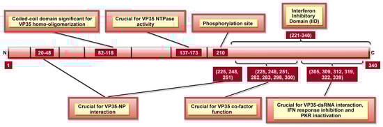 A schematic representation of EBOV viral protein 35 (VP35). VP35 aa 137–173 are significant for VP35 NTPase activity, which affects viral transcription and rep-lication. Interferon inhibitory domain (IID; aa 221–340) consists of aa 225, 248, and 251 which are involved in two roles: VP35-NP interaction (along with N-terminal aa 20–48) and VP35 co-factor function (along with IID aa 282, 283, 298, and 300). Phosphorylation of aa 210 regulates VP35-NP interaction, as well as viral transcription and replication.