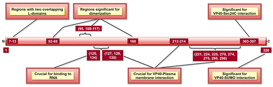 VP40, the most abundantly expressed protein [28], is essential for viral assembly and budding [141]. VP40 aa 292–295 (Table 2) were reported as critical for VLP production and controlled inhibition of viral transcription, as a mutation in 292–295 aa sequence altered these functions [116]. A recent study suggested that aa 326 (Figure 6) is involved in SUMO–VP40 interaction which is significant for VP40 stability [142]. Additionally, VP40 contains two late budding domains (L-domains) located at aa 7–10 (PTAP) and aa 10–13 (PPEY) (Figure 6) [143], interacting with host proteins. PTAP makes a complex with tumor susceptibility gene 101 protein (tsg101) [144], while PPEY binds to ubiquitin ligase, neuronal precursor cell-expressed developmentally downregulated 4 (Nedd4) [145], as well as to ITCH E3 ubiquitin ligase [146]. The PTAPtsg101 interaction helps recruit VP40 into lipid raft domains on the plasma membrane [143], while the PPEY–Nedd4 complex covalently ubiquitinates viral matrix proteins, which is required for virus budding [145]. These data strongly suggest that L-domains are essential for budding [147] but limited in viral replication [148].