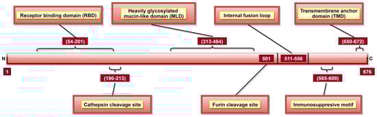 GP1 mediates attachment to host cells using the receptor-binding site (RBS) located at aa 54–201 (Figure 7) [122]. Studies have identified multiple aa (Table 2) as critical for viral entry [117,118,119,120,121,156]. Among these, aa 64, 95 [121] and 114, 115, 140 [124] are involved in direct contact with host cell receptors while aa 43, 54, 56, 60, 61 and 79 contribute to post-binding steps of viral entry [121]. A Mucin-like domain (MLD) was identified in aa 313–464 (Figure 7) [120], which does not directly impact viral entry [32] but can stimulate host dendritic cells by activation of mitogen-activated protein kinase (MAPK) and nuclear factor kappa B (NF-κB) pathways [157].