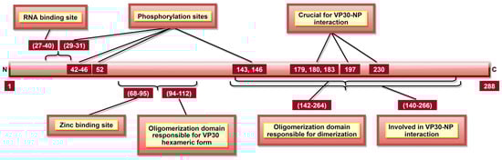 VP30 is a structural, hexameric phosphoprotein composed of three dimers [33,129]. Dimers are formed by aa 142–264, while aa 94–112 (Figure 8) are required to produce hexameric form [129,178]. VP30 aa 27–40 (Figure 8) form a disordered, non-hydrophobic, arginine-rich region interacting with viral RNA [127]. VP30 is indispensable for RNA transcription initiation [128]. Interestingly, mutations at aa 179, 180, and 183 render VP30 incapable of transcription initiation, suggesting their importance in this process [129].