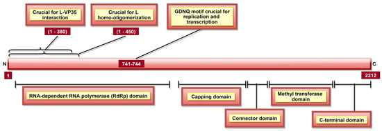 L, a part of the RNP complex [36], is the largest, multi-subunit and multifunctional EBOV protein composed of 2212 aa [36] (Table 1). There are five domains in L protein (Figure 10), namely, (a) RNA-dependent RNA polymerase (RdRp) domain with transcription/replication and polyadenylation activity, (b) capping domain with polyribonucleotidyl transferase (PRNTase) activity, (c) connector domain (CD) with an organizational role, (d) a methyltransferase domain with MTase activity, and e) a small C-terminal domain (Table 3, Figure 10) [190]. In addition, EBOV L residues 1–450 contain a homo-oligomerization domain (Figure 10) [105]. L protein aa 1–380 (Figure 10) are involved in L-VP35 interaction, which happens in a non-competitive manner and does not require L homo-oligomerization [105]. The L-VP35 binding enables re-localization of L into viral inclusion bodies. In addition to VP35, The RESTV L protein was shown to interact with VP30 [191].