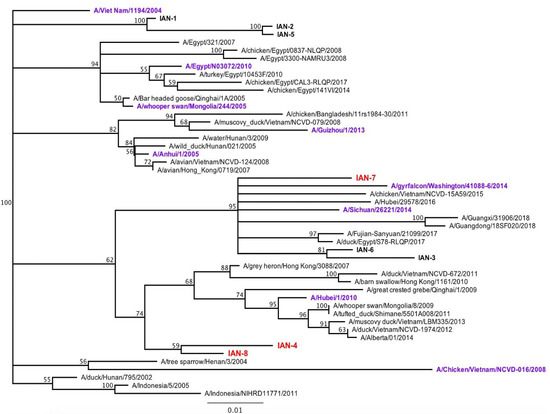 The H5 highly pathogenic avian influenza viruses from the genetic clade 2.3.4.4 emerged in China in 2010–2011. These viruses were detected in birds in more than 24 countries in the eastern hemisphere [1]. As of February 2020, the World Health Organization (WHO) reported 24 cases of human infections [2] by viruses of the H5N6 subtype, which is the only 2.3.4.4 clade H5 influenza virus that has infected people [3]. The newest cases of H5N6 virus infections in humans both occurred in China in September 2017 and recent infections in people with viruses that had HA proteins that were phylogenetically distinct from one another [4]. In 2014, H5N8 Eurasian subtypes was detected in U.S. Washington state in captive falcons, wild birds, and poultry [5,6]. These viruses spread across the central regions of North America devastating the poultry industry [6]. The clade 2.3.4.4 viruses from Africa and Europe were primarily of the H5N8 subtype, whereas those viruses isolated in Asia are in the H5N6 subtype and those strains isolated in the United States are classified as H5N2 isolates [4]. Clade 2.3.4.4 H5Nx viruses isolated from Africa and Europe are primarily of the H5N8 subtypes and those found in Asia are H5N6 subtype [1]. The H5N8 viral subtype caused an outbreak in 2014 in South Korea leading to a distinction of two different H5N8 virus subgroups [6,7,8]. Group A comprises a set of H5N8 isolates and is referred to as the intercontinental group A (icA) group. The icA H5 viruses further evolved into 3 different subgroups, icA1, icA2, icA3 [6].