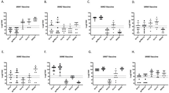 Mice vaccinated with the next-generation H5 COBRA HA antigens elicited antibodies with HAI activity against different sets of H5Nx viruses (Figure 3). IAN-3 and IAN-6 HA vaccinated mice elicited antibodies that had similar HAI activity as antibodies elicited by the wild-type clade 2.3.4.4 HA proteins from Si/14 and gy/WA/14 (Figure 3C,F). Mice vaccinated with IAN-2 HA did not elicit antibodies with HAI activity against any of the viruses in the panel (Figure 3B). Overall, only three out of the eight next generation H5 HA vaccines, IAN-4, IAN-7 and IAN-8 HA vaccines elicited antibodies with HAI activity against H5 viruses in all four clades. All mock vaccinated mice were serologically negative to the viruses in the panel.