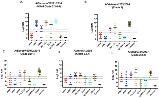 Hemmaglutinin inhibition antibodies elicited against the two viral challenge strains and 3 additional H5 viruses. Serum from mice taken 2 weeks following final vaccination in a prime-boost-boost model was tested against (A) Si/14 (B), VN/04 (C) A/Eg/10 (D) An/05, and (E) Eg/07. Antibody responses were calculated according to serum dilution, a value of 5 was given for a negative response. The two dashed lines represent HAI titers of 20 and 40. Viruses used were 6 + 2 recombinant, PR8-backbone isolates.