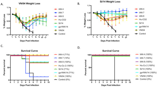 Weight loss data and survival curves from Vn/04 and Si/14 intranasal challenge. Four-weeks following the last boost vaccination, mice were intranasally challenged with (A) VN/04 or (B) Si/14 PR8 virus and weight loss was monitored daily for 10–11 days post-infection. Survival rates of mice vaccinated with either next-generation IAN vaccines or wild-type control were calculated for (C) VN/04 challenge and (D) Si/14 challenge.