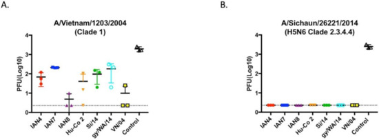 Previously, mice vaccinated with VLP vaccines expressing the Hu-CO2 HA did not survive challenge and the collected antisera did not have HAI activity against the Si/14 virus. However, neutralizing antibody titers were detectable at higher concentrations [30] and the Hu-CO2 HA vaccinated mice survived a challenge. This may be due to increased antibody titers against HA specific epitopes, since these vaccines lack of NA and Gagp24 core proteins that are included in VLP vaccine formulations. The Hu-CO2 COBRA HA vaccine decreased the pathogenicity induced by the H5N6 influenza virus infection. IAN-8 HA vaccine appears to elicit immune responses against 2.3.2.1 H5Nx influenza viruses and future studies could be performed to demonstrate if IAN-8 HA induced immune responses protect against highly pathogenic variants of H5N6 or H5N8.