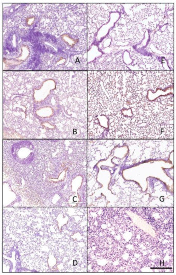 Immunohistochemistry of lungs taken 3 days following viral infection of Si/14 virus. Lungs were taken from euthanized mice and fixed in formalin for 1 week prior to examination. Immunohistochemistry (IHC) was performed on 5 µm lung slices to determine pathology and cellular infiltrates in vaccinated and non-vaccinated groups. (A) IAN-4, (B) IAN-7, (C) IAN-8, (D) Hu-CO2, (E) Si/14, (F) VN/04, (G) control infected (H) control mock (not infected). Bar represents 300 µm.