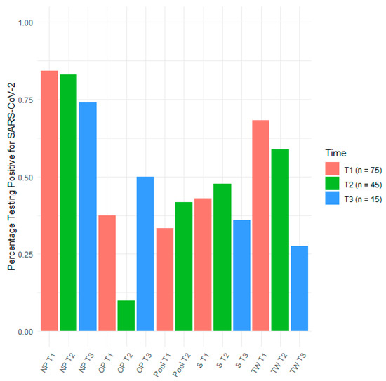 The following are available online at https://www.mdpi.com/article/10.3390/pathogens10111362/s1, Table S1: Effect of time on viral load (CT values) in each sample specimen., Table S2: Comparison of the agreement between NP and TW (Cohen’s kappa coefficient) at T1, Table S3: Effect of rhinorrhea on the probability of detecting SARS-CoV-2 at T1, Table S4: Effect of fever on the probability of detecting SARS-CoV-2 at T1, Table S5: Effect of sore throat on the probability of detecting SARS-CoV-2 at T1.