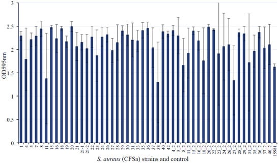 Comparison of biofilm formation by S. aureus strains isolated from the pediatric patients with cystic fibrosis. The bacterial strains were incubated in TSB supplemented with 3.0% NaCl and 0.5% glucose at 37 °C overnight with shaking at 220 rpm. The bacterial culture was re-inoculated in the well of 96-well flat-bottom plates containing fresh TSB supplemented with 3.0% NaCl and 0.5% glucose and incubated at 37 °C overnight without shaking. Four repeats were included for each strain. The biofilm was stained with crystal violet solution and measured as described in the Materials and Methods. The number of axial is the strain number of CFSa. S. aureus strain 15981 was used as a positive control of biofilm formation.