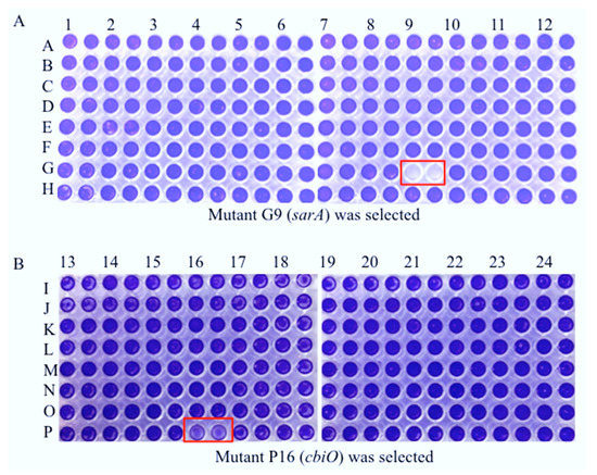 Screening Tn mutants with a weak capacity of biofilm formation using a Nebraska transposon mutant library. The Tn mutants were incubated in TSB supplemented with 3.0% NaCl, 0.5% glucose, and 5 μg/mL erythromycin at 37 °C overnight without shaking. The culture was re-inoculated in the well of 96-well flat-bottom plates containing fresh TSB supplemented with 3.0% NaCl, 0.5% glucose, and 5 μg/mL erythromycin, in duplicate, and incubated at 37 °C without shaking. The parental control JE2 was used as a positive control. The biofilm was stained with crystal violet solution and measured as described in the Materials and Methods. The red color box indicates a reduced biofilm formation by the mutant. (A) a mutant in G9 was identified and (B) a mutant in P16 was identified.