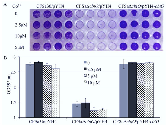 Impact of the addition of cobalt ions on the defect of biofilm formation by cbiO null mutant. The cbiO null mutant CFSa36ΔcbiO/pYH4, complementary strain (CFSa36ΔcbiO/pYH4-cbiO), and their parental control CFSa36/pYH4 were incubated in CDM supplemented with 5 μg/mL erythromycin at 37 °C overnight with shaking at 220 rpm. The cultures were re-inoculated in CDM with Erm5 and different concentrations of CoCl2, and incubated in a 96-well format at 37 °C overnight without shaking. Four repeats were included for each strain. (A) Impact of the addition of cobalt ions on the biofilm defect phenotype of cbiO null mutant, and (B) quantitatively determine the impact of the addition of cobalt ions on biofilm formation. The data were statistically analyzed with a T.TEST. The results are representative of at least three independent repeats.