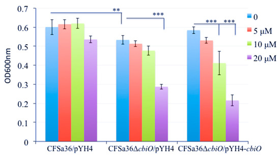 Effect of the addition of copper ions on the growth of cbiO null mutant, its complementary strain, and parental control. The cbiO null mutant CFSa36ΔcbiO/pYH4, complementary strain (CFSa36ΔcbiO/pYH4-cbiO), and their parental control CFSa36/pYH4 were incubated in CDM supplemented with 5 μg/mL erythromycin at 37 °C overnight with shaking at 220 rpm. The cultures were re-inoculated in CDM with Erm5 and the different concentrations of CuSO4, and incubated in a 96-well format at 37 °C overnight without shaking. Four repeats were included for each strain. The bacterial growth was determined by measuring the optical density of bacterial cultures at 600 nm. The data were statistically analyzed with a T.TEST. The results are representative of at least three independent repeats. The symbol ** represents p < 0.01 and the symbol *** represents p < 0.001.