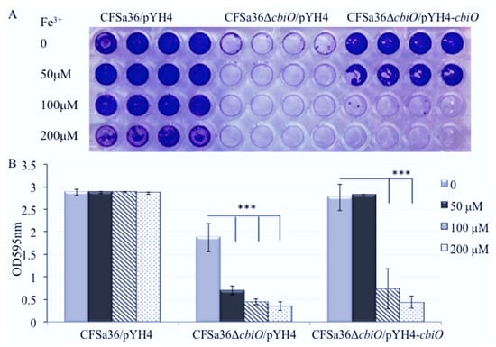 Effect of the addition of iron ions on the defect of biofilm formation by cbiO null mutant. The cbiO null mutant CFSa36ΔcbiO/pYH4, complementary strain (CFSa36ΔcbiO/pYH4-cbiO), and their parental control CFSa36/pYH4 were incubated in CDM supplemented with 5 μg/mL erythromycin at 37 °C overnight with shaking at 220 rpm. The cultures were re-inoculated in CDM with Erm5 and the different concentrations of FeCl3, and incubated in a 96-well format at 37 °C overnight without shaking. Four repeats were included for each strain. (A) Effect of the addition of iron ions on the biofilm defect phenotype of cbiO null mutant, and (B) quantitatively determine the effect of the addition of iron ions on biofilm formation. The data were statistically analyzed with a T.TEST. The results are representative of at least three independent repeats. The symbol *** represents p < 0.001.