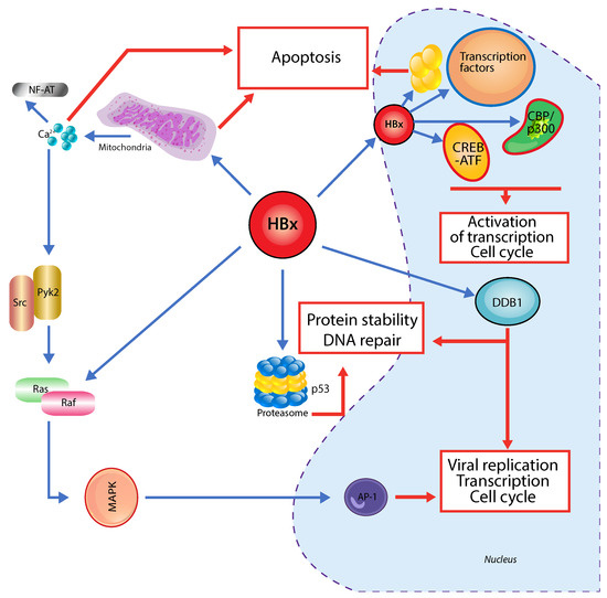 Plasmatic and intranuclear activity and protooncogentic activities of HBx-Protein in HBV. Hbx interacts with CBP/P300 affecting directly the CREB-dependent transcription. Indirectly it affects the transcription and cell cycle by acting on cellular signaling pathways such as Ras/Raf, MAPK and JAK/STAT. Apoptotic effects of Hbx are reached by affecting proteasomes, mitochondrial proteins, p53 and DDB1. HBV—Hepatitis B Virus; CBP—CREB binding protein; CREB—cAMP response element-binding protein; Ras—Rat sarcoma virus; MAPK—mitogen-activated protein kinase; JAK—Janus Kinase; STAT—Signal transducer and activator of transcription (Adapted from Neuveut C. et al. [46]).
