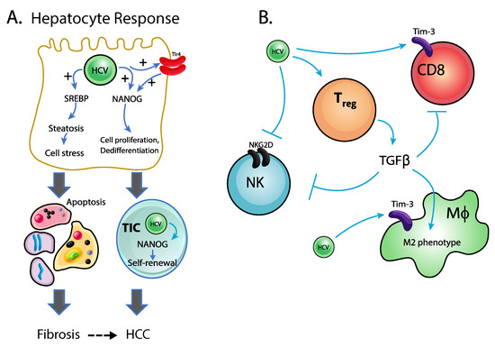 Impact of HCV on liver function and immunological response. (A). HCV infection leads to upregulation of SREBP (sterol receptor element binding protein) and Tlr4-augmented NANOG activation resulting in cell stress mediated apoptotic cell death and/or cellular transformation toward tumor initiating stell-like cells (TIC) whereby both hyperproliferative transformation as well as hepatocellular apoptosis driven fibrogenesis are risk factors for HCC development. (B). HCV infection enhances regulatory T cell recruitment and transforming growth factor b mediated suppression of NK cells and CD8+ T cells while also promoting an M2 phenotype within intrahepatic macrophages. Tim3 (T cell immunoglobulin and mucin domain-containing protein 3).