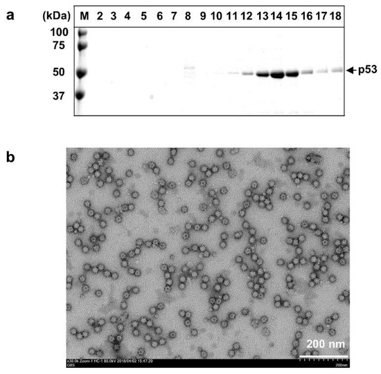 The recombinant baculovirus-infected Tn5 cells were harvested on day 7 post-infection (p.i.), and the supernatant was concentrated at 126,000× g for 3 h in a Beckman SW32Ti rotor. The resulting pellet was resuspended in EX-CELL 405 medium at 4 °C overnight. For CsCl gradient centrifugation, 4.5 mL of the samples was mixed with 2.1 g of CsCl and centrifuged at 100,000× g for 24 h at 10 °C in a Beckman SW55Ti rotor. The gradient was fractionated into 250 µL aliquots; each fraction was diluted with EX-CELL 405 medium and centrifuged for 2 h at 100,000× g in a Beckman TLA55 rotor to pelletize the VLPs. Fractions 2 to 18 were analyzed by electrophoresis on 5–20% polyacrylamide gels and stained with Coomassie Brilliant Blue (CBB), a 53-kDa protein (p53) band that processed from N-terminal 111 aa-truncated ORF2 of HEV-8 was primarily distributed in fractions 13–15 with an average density of 1.286 g/cm3 (range: 1.282–1.290 g/cm3) (Figure 1a). To observe the VLPs we placed the sample on a carbon-coated grid for 45 s, rinsed with distilled water, and stained with a 2% uranyl acetate solution. The grids were observed under a transmission electron microscope (HT7700; Hitachi High Technologies, Tokyo, Japan) at 80 kV. Electron micrographs revealed many spherical particles with a diameter of approx. 24 nm throughout these fractions (Figure 1b).