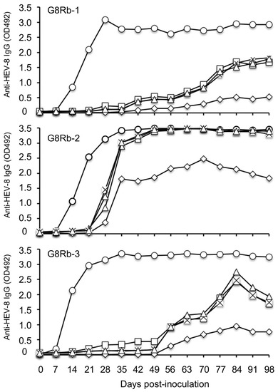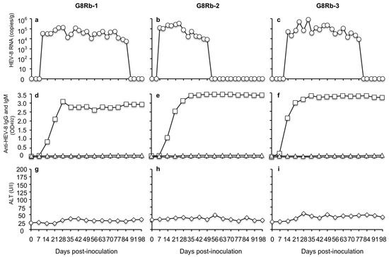 The anti-HEV-8 IgG antibodies were first detected on days 14, 14, and 7 p.i. with the OD values of 0.850, 1.069, and 0.199 in rabbits G8Rb-1, G8Rb2, and G8Rb-3, respectively, and the antibody levels quickly peaked on days 28, 35, and 35 p.i. with the OD values of 3.078, 3.418, and 3.416, respectively. Until day 98 p.i., no significant changes in the OD values were observed. Interestingly, neither the anti-HEV-8 IgM antibody responses (Figure 2d–f) nor the ALT elevations were observed until day 98 p.i. (Figure 2g–i). These results indicated that the HEV-8 seemed to cross-infect the rabbits, inducing unique immune responses without any clinical signs.