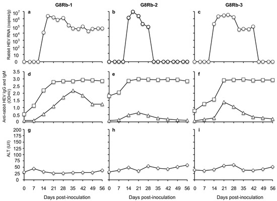 The results of the antibody ELISA based on the VLPs of rabbit HEV indicated that a significant increase of anti-rabbit HEV IgG antibodies occurred in all three rabbits on day 7 p.i. and peaked on day 21 p.i. The anti-rabbit HEV IgM antibodies were detected on day 7 p.i. and peaked on days 35, 21, and 21 p.i., in rabbits G8Rb-1, -2 and -3, respectively, and then gradually decreased (Figure 3d–f). No significant ALT elevation was observed in any of the rabbits (Figure 3g–i). These results demonstrated that the HEV-8-infected rabbits were further infected with rabbit HEV; in other words, the HEV-8-infected rabbits were not protected from infection by rabbit HEV.