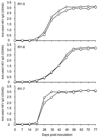 The animal experiments were reviewed and approved by the institutional ethics committee and were performed according to the ‘Guides for Animal Experiments at the National Institute of Infectious Diseases, Tokyo, Japan’ under codes 514014 (18 December 2014), 516001 (24 March 2016), and 520003 (24 December 2020). The rabbits were negative for the anti-HEV IgG and IgM antibodies and HEV RNA, and they were individually housed in a Biosafety Level-2 facility.