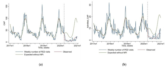 A total of 981,782 PEDs visits in the six participating centers from 1 January 2017 to 31 December 2020 were included. Among them, 91,087 were followed by a hospital admission. Overall, 8318 PED visits were diagnosed as CAP, and 1774 of these were followed by a hospital admission. Data collected before March 2020 were used to generate a model fitting the observed values of the PEDs visit, admission and CAPs, allowing us to project the number that could have been expected without NPIs.