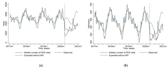 Outcomes were analyzed by quasi-Poisson regression, accounting for seasonality, secular trend before and after lockdown, and overdispersion of data [26,27,28,29]. Seasonality was taken into account by including harmonic terms (sines and cosines) with 12-month and 6-month periods to adjust for the seasonal pattern [29]. The time unit chosen was one week to provide optimal precision to the model [26]. We hypothesized that the intervention would have an impact on the next time unit considering the incubation time of most viral diseases. Thus, intervention assessment involved a dummy variable in the model estimating the immediate post-intervention change [26,28]. Pre-intervention period was from 1 January 2017 to 17 March 2020 and post-intervention period was from 18 March 2020 to 31 December 2020. Intervention impact was estimated by comparing estimates in the post-intervention period to expected estimates if the lockdown did not occur, based on the quasi-Poisson regression model. We decided to analyze crude numbers rather than number per 1.000 PED visits because NPI had a major impact not limited to infectious diseases [2,7,8].Validity of the quasi-Poisson regression model was assessed by visual inspection of the correlograms (autocorrelation and partial autocorrelation functions) and residuals analysis. All statistical tests were two-sided, and we considered a result as “significant” when the p-value was < 0.05. All statistical analysis involved using Stata (StataCorp. 2019. Stata Statistical Software: Release 16. College Station, TX: StataCorp LLC).