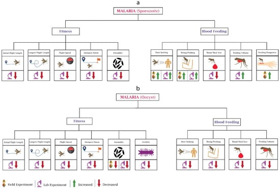 The malaria parasite Plasmodium affects the fitness of female Anopheles mosquito differently during sporozoite (Figure 1a) and oocyst (Figure 1b) development stages. Fitness involves behaviours such as flight, mating, fecundity, and reproduction capacity, and a wide range of studies have been conducted on Plasmodium’s ability to alter its vector’s fitness. Researchers [19] focused on the changes in flight activity of An. stephensi-infected P. cynomolgi, which can cause disease in monkeys, and found a reduction in the distance flown, flight speed, length of initial flight, and longest flight. Interestingly, the impact on mosquitoes’ flight activity was also found to be maximum when rodent malaria parasite P. yoelii completed the oocyst development phase and sporozoite reached the salivary glands [20].