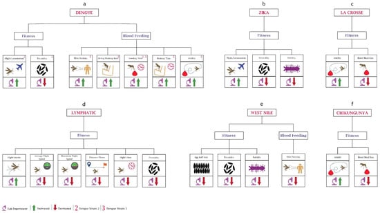 Behavioural changes in mosquitoes due to viruses: (a) In dengue, the majority of the work has been performed on the blood-feeding behaviour. Most of the data are based on research using DENV-2. DENV-3 has been used to determine changes in feeding time. (b) In Zika, studies have been only performed on the mosquito’s fitness. (c) Mosquito fitness changes after infection with La Crosse virus. (d) Mosquito behavioural changes after infection with lymphatic filariasis is shown here. (e) In the case of the West Nile virus, little work has been performed on both fitness and blood feeding. (f) Chikungunya virus infection leads to changes in the avidity and blood feeding size of the mosquitoes.