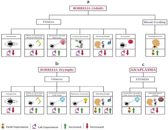 Behavioural changes in ticks (adult, nymph) due to Borrelia and Anaplasma: Tick-borne diseases’ pathogens impact the fitness and blood feeding of the ticks. (a) In Borrelia, the majority of work has been performed on the fitness. (b) Contrary to adults, in Borrelia-infected nymphs, ability to overcome physical obstacles, attraction towards cold areas, and questing heights increases. (c) In Anaplasama, research has only been performed on nymphs’ attraction towards cold areas and questing speed of adults.