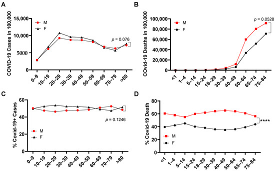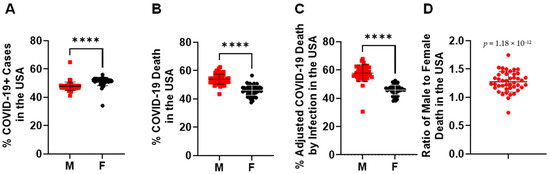 Cases of SARS-CoV-2 infection and death are publicly available and were retrieved from the GenderSci Lab COVID Project [14]. Characteristics such as gender and age were used in the analysis from published CDC data as of 21 June 2021. Data from all 50 states of the United States of America and its two territories, Puerto Rico and US Virgin Islands, were reported. The data of infection in males or females were calculated from the total number of COVID-19+ infections in the US, while male or female COVID-19-related deaths were calculated from the overall total of COVID-19 associated deaths. The database does not include data for patients who tested negative for the virus.