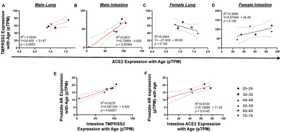 Tissue TMPRSS2/ACE2/AR expression correlated with each other by age in vivo. (A and C) There is a trend of TMPRSS2 expression correlated with ACE2 expression in male but not female lung. (B and D) Upregulation of TMPRSS2 significantly correlated ACE2 expression in male but not female intestine. (E) In prostate, upregulation of AR significantly correlated with TMPRSS2 expression. (F) In prostate, upregulation of AR significantly correlated with ACE2 expression. The linear regression was analyzed with the mean values of tissue gene expression, where p < 0.05 was considered significant and 0.05 < p < 0.09 was considered a trend of significance.