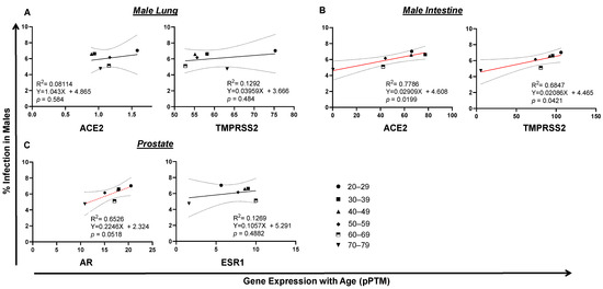 Unlike SARS-CoV-2 infection, which reached its plateau at the age of 20–29, the incidence of death kept rising from ages 4–84 years old in both infected men and women (Figure 2A,B). To see whether there is any potential link between tissue TMPRSS2/ACE2 expression, morbidity and/or fatality of SARS-CoV-2 infection, we set out to analyze the correlation of gene expression with SARS-CoV-2 infection and COVID-19 death. RNA-seq data were derived from the HPA Program (Figure S1), which is the only tissue gene expression data suitable for our statistical data analysis with matched age and gender. Since no RNA-seq data were available for tissue gene analysis for people aged from 0–19, only gene expression data from people aged from 20 to 79 years of age were examined in this study. In the male, lung TMPRSS2 or ACE2 expression was not associated with SARS-CoV-2 infection. Surprisingly, intestinal TMPRSS2 (p = 0.0421) and ACE2 (p = 0.0199) expression positively correlated with SARS-CoV-2 infection in men (Figure 4A,B), which was also related to age. A positive correlation was observed between the expression of prostate androgen receptor AR (p = 0.0518) with SARS-CoV-2 infection by age in men (Figure 4C). Interestingly, the expression of ESR1, the nuclear receptor of female estrogen existed in men, was not correlated with SARS-CoV-2 infection. In fact, in female lung or intestine, a negative association was discovered between ACE2 expression and SARS-CoV2 infection (Figure 5A,B). Instead, the expression of breast AR, the receptor of male testosterone in women, significantly correlated with SARS-CoV2 infection (p = 0.0422) (Figure 5C). These data suggest that TMPRSS2/ACE2 expression has opposite impacts on SARS-CoV-2 infection between men and women.