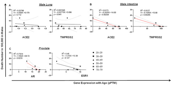 Tissue TMPRSS2/ACE2/AR expression negatively correlates with COVID-19 fatality in men. (A) No correlation of COVID-19 fatality with lung ACE2 or TMPRSS2 expression in men. (B) Downregulation of intestine TMPRSS2 or ACE2 expression significantly correlated with COVID-19 fatality in men. (C) Downregulation of prostate AR, but not ESR1, significantly correlated with COVID-19 fatality in men. The linear regression was analyzed with the mean values of tissue gene expression vs. COVID-19 male death rate in the United States, where p < 0.05 was considered significant.