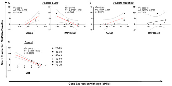 Surprisingly, in lung, the expression of TMPRSS2 or ACE2 was not correlated with male death (Figure 6A). In contrast, the low expression of intestinal ACE2 (p = 0.00264) or TMPRSS2 (p = 0.00295) was correlated with a high level of COVID-19 death in men, which is seemingly related to age (Figure 6B). Since male COVID-19 death was much higher than female death, which kept increasing by age (Figure 2B,D), we reasoned that this death incidence in men may be associated with impaired male hormone signaling. We found that reduced male hormone signaling was involved in a high rate of male COVID-19 death, since higher levels of male hormone receptor AR (p = 0.0233) were correlated with lower COVID-19 death by age in men (Figure 6C). This correlation was not observed with the expression of ESR1, the receptor of the female hormone (Figure 6C). An opposite link was observed, since either lung or intestine ACE2 expression was positively correlated with COVID-19 death in women (Figure 7A,B). Strikingly, the expression of breast AR, the receptor of the male hormone, negatively correlated with death (p = 0.00879; Figure 7C). Together, these data indicate that a low level of TMPRSS2/ACE2 signaling in the intestine may account for the deaths in men, which may be related to the waning level of male hormone signaling during aging. However, this is not the case in COVID-19 deaths among the female population.