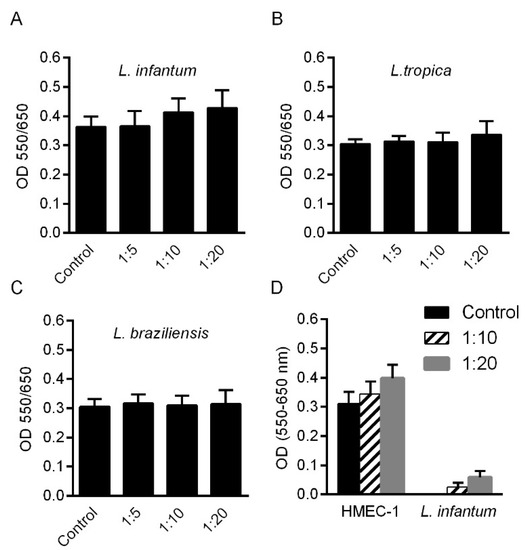 HMEC-1 viability after 24 h of co-incubation with Leishmania spp. Cells were left untreated (control) or treated for 24 h with promastigotes of L. infantum (A), L. tropica (B) or L. braziliensis (C) at different cell:promastigote ratios (1:5, 1:10, 1:20). Promastigotes of L. infantum were cocultured with HMEC-1 or were grown alone for 24 h (D). Cell viability was measured by MTT assay. Data are expressed as OD (550/650) means ± standard deviation (SD) of three independent experiments. One-way ANOVA, Tukey’s multiple comparisons.