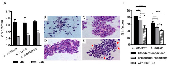 L. infantum morphology was evaluated by Giemsa smears at different incubation times (0, 4, 24 h) in cell culture conditions (Figure 2B–D). After 4 h, some Leishmania promastigotes appeared enlarged with a visible flagellum, whereas some others were smaller, rounded forms with a short flagellum (Figure 2C). After 24 h, all the parasites appeared rounded with short or even with no visible flagellum (Figure 2D). The same morphology was observed when Leishmania promastigotes were co-incubated with HMEC-1 (Figure 2E). In addition, some parasites appeared with a pale cytoplasm and broken cell membranes (red arrows in Figure 2E).