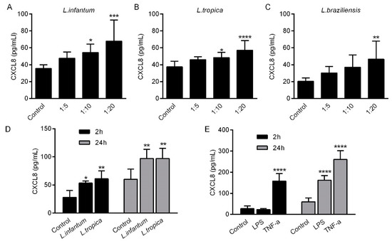 HMEC-1 were left untreated (control) or co-incubated with promastigotes of L. infantum, L. tropica or L. braziliensis at different cell: Leishmania ratio for 24 h. Thereafter, CXCL8 levels were measured in cell supernatants. Exposure of HMEC-1 to promastigotes of Leishmania spp. stimulated the production of CXCL8 in a concentration-dependent manner (Figure 3A–C). A cell: Leishmania ratio of 1:10 was sufficient for inducing significant amount of CXCL8, compared to untreated controls. In addition, time course experiments indicated that after 2 h of co-incubation, a significant amount of CXCL8 was induced by both L. infantum and L. tropica (Figure 3D). When, LPS or TNFα, were used as positive controls, only TNFα, but not LPS, induced significant levels of CXCL8 after 2 h of stimulation (Figure 3E).