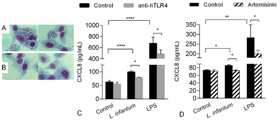 HMEC-1 were co-incubated with L. infantum for 24 h in chamber slides. Cell were fixed with methanol and stained with Giemsa immediately (A) or extensively washed with PBS to remove free Leishmania parasites (B). (C) CXCL8 production by HMEC-1 incubated with promastigotes of L. infantum in the presence of an anti-TLR4 antibody. Cells were left untreated (control) or incubated with or without 0.5 µM of an anti-TLR4 antibody (hTLR4) before the addition of L. infantum promastigotes or LPS for 24 h. Data are expressed as the mean ± standard deviation (SD) of three independent experiments. (D) CXCL8 production by HMEC-1 incubated with promastigotes of L. infantum in the presence of artemisinin 10 µM. Data show one representative experiment. CXCL8 levels released in cell supernatants were measured by ELISA. * p > 0.05; ** p > 0.01; **** p > 0.0001 vs. control 2-way ANOVA, Tukey’s multiple comparisons test.