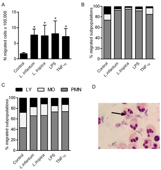 Percentage of leukocytes (A) and percentage of leukocyte subpopulations (B,C) migrated towards conditioned media from unstimulated or Leishmania-stimulated HMEC-1. Supernatants of cells stimulated with L. infantum or L. tropica promastigotes (1:10, cell:parasite ratio), LPS (100 ng/mL) or TNF-α (100 U/mL) for 24 h were collected and inserted into a transwell system. Human PBLs were then plated on top of the filter membrane and the migrated leukocytes were collected, counted and immobilized onto glass microscope slides after 2 h (A,B) and 24 h (C) of incubation at 37 °C. Slides were stained with Giemsa and the percentages of the different subpopulations were counted by light microscopy. * p > 0.05 vs. control, 1-way ANOVA, Dunnett’s multiple comparisons test. Neutrophils were recovered and incubated with L. infantum promastigotes. After incubation, both cells and parasites were recovered and Giemsa-stained smears prepared. Black arrow shows parasites inside neutrophils (D).