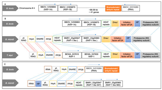 Synteny map of the rap-1 locus of T. equi, putative rap-1 B. microti, and typical s.s. B. bovis. (A) Structure of the prap-1 and rra genes localized in the chromosome 4 of B. bovis. (B) Conserved synteny among the rap-1 loci of B. bovis and T. equi and the BMR1_03g00960 (BmIPA48) and BMR1_03g00947 (Bm960) genes of B. microti, that encode for proteins containing the typical Cys-rich region of the pRAP-1 proteins. (C) Conserved synteny among the B. bovis rra and the B. microti BMR1_03g00960 and BMR1_03g00947 genes.