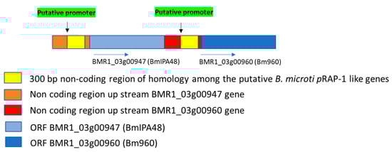 Schematic representation of the locus encoding for the B. microti RAP-1 putative proteins BmIPA48 and Bm960. A ~300 bp region upstream the two ORFs is repeated (yellow boxes).