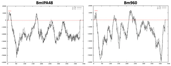 Predicted secondary structure of the pRAP-1-like proteins BmIPA48 and Bm960 using the Program TMpred. Predicted location of signal peptide (SP) is marked with a red bar. A dashed red line marks the boundary between predicted hydrophilic and hydrophobic transmembrane regions of the proteins.