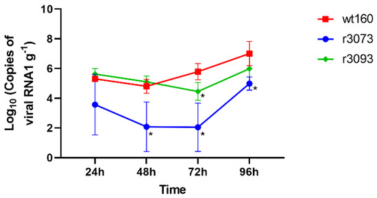 The analysis of the viral genome in randomly sampled fish showed a significant increase in the number of wt160-RNA1 copies from 48 to 96 h p.i. (Figure 2).