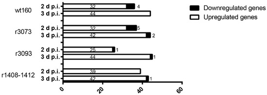 Most of DEGs were upregulated; specifically, at 2 days p.i., the number of DEGs ranged from 26 (25 upregulated and 1 downregulated) in the r3093-infected group (RNA1 mutant) to 39 (all of them upregulated) after the infection with the double-RNA2 mutant (r1408-1412), with 36 (32 upregulated and 4 downregulated) as the number of DEGs recorded in the wt160-challenged group and 37 after infection with r3073, 32 upregulated coinciding with the number of upregulated genes after the infection with the wt160 at that time point.