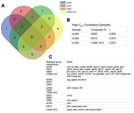 Differentially expressed genes (DEGs) in Solea senegalensis 3 days after the infection with wt160, r1408-1412, r3073 or r3093. (A) Venn diagram analysis of the number of DEGs shared by the four virus-infected groups. (B) Correlation coefficients (r) of target gene Cq values obtained after the infection with each mutant confronted with values obtained after the infection with the wild type virus. (C) Gene profile of each overlapping area obtained with the Venn diagram analysis.