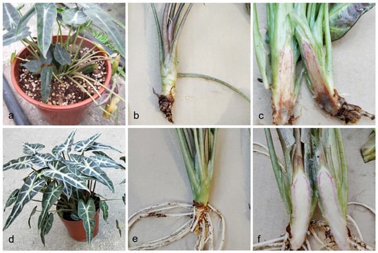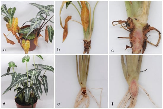 Inoculation assays of stem and root rot on Alocasia longiloba (inoculated with ZHKUCC 21-0005). (a–c) Symptom of stem and root rot after 15 days of inoculation; (d–f) Control plants of A. longilob after 15 days of inoculation.