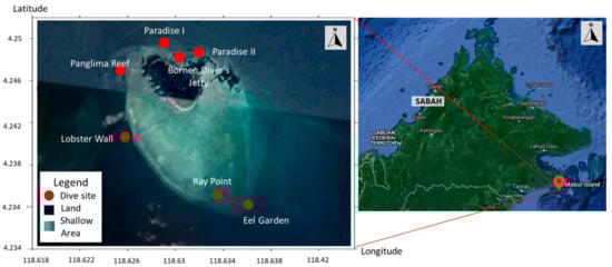 Map of Mabul Island indicating the dive sites where sea turtles were captured. The inset (left) shows the location of the island at northern Borneo at the south-eastern region of Sabah, Malaysia. Mabul island (right) is highlighted in dark green while the surrounding shallow area in light green (image taken from Google map).