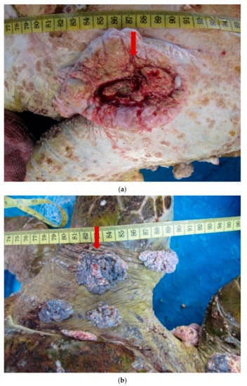A previous study by Greenblatt et al. [] implied that sea turtles may have a passive infection where the pathogenesis of the infection depends on environmental triggers such as pollutants and marine leeches. Similarly, Tristan et al. [] reported that sea turtles living in habitats that are nearby urban development and are of close proximity with human contact have increasing chances to develop the tumours.