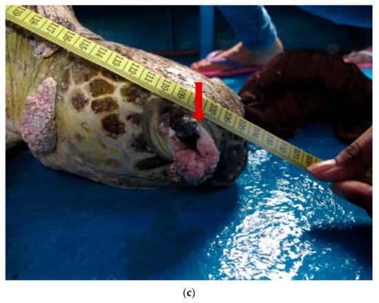 We observed that morphologically, all the tumours were a combination of either smooth or verrucous. Most tumours were soft while some appeared to be rigid. The nodules were firm and pale, with similar morphology to those described in earlier studies [,]. One individual had a debilitating advanced stage of FP with tumours in all regions of the body (hind flippers, plastron, neck, and carapace) (Figure 2a,b). Multiple nodules, ranging from 1 to 7 cm in diameter, were present on the ventral surfaces of both back flippers. The nodules contained numerous leeches, but these parasites were not examined in the current study. Two of the turtles had tumours on the eye lid (Figure 2c) which impacted their vision.