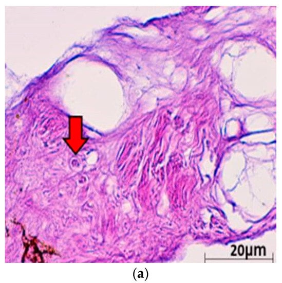 Histopathological examinations were conducted to provide evidence of ChHV5 in tumour tissue. Light microscopic examination of the tumour lesion that was biopsied revealed the presence of Horn Cyst (Figure 3). Hyperkeratotic epidermis (characterised as papilloma) and acanthosis with Epidermal intracellular inclusion bodies (EIIs) were also identified (Figure 3a–c). Horn Cysts indicate a viral infection and confirm the presence of ChHV5 in the tumours []. The Hyperkeratotic epidermis and acanthosis with epidermal intracellular inclusion bodies (EIIs) implies a transcriptionally active (i.e., non-latent) state of ChHV5 in FP tumours of the affected Green turtles. IILs are commonly found on the outer layer of the epidermis []. Therefore, it is transmitted easily when in contact with other foraging turtles or spread into the environment. This observation is consistent with the previous reports for FP in sea turtles [,,], and further supports the initial hypothesis by Jacobson et al. [] that the virus is replicating in FP tumours from sea turtles. The results seem to indicate that ChHV5 plays an active role in FP of Green turtles and could be horizontally transmitted between regions based on the phylogenetic analysis.